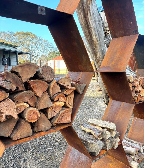 Locally designed and manufactured using 3mm mild steel. Design features unique, generously sized hexagonal honeycomb shaped log storage shelves.